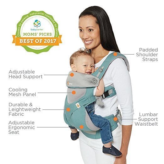 With its unique, structured bucket seat, the versatile Ergobaby 360 baby carrier with Cool Air Mesh keeps baby ergonomically seated in all carrying positions (front-outward, front- inward, hip and back carry). This carrier can be worn with Ergobaby Infant Insert from 7-12 pounds, and until your baby is 45 pounds. Adjustable head support, durable, lightweight, lumbar support waistbelt and much more make the Ergobaby 360 baby carrier a high quality baby carrier and a best seller in todays market.